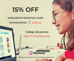 Tenemos el agrado de informarles que los estudiantes del Instituto Anglo cuentan con un descuento especial del 15% de descuento para ser utilizado en los libros de nuestros cursos: Juniors 1, Pre Intermediate level 2, Senior 6 e Intermediate level 2 de Richmond – Santillana.