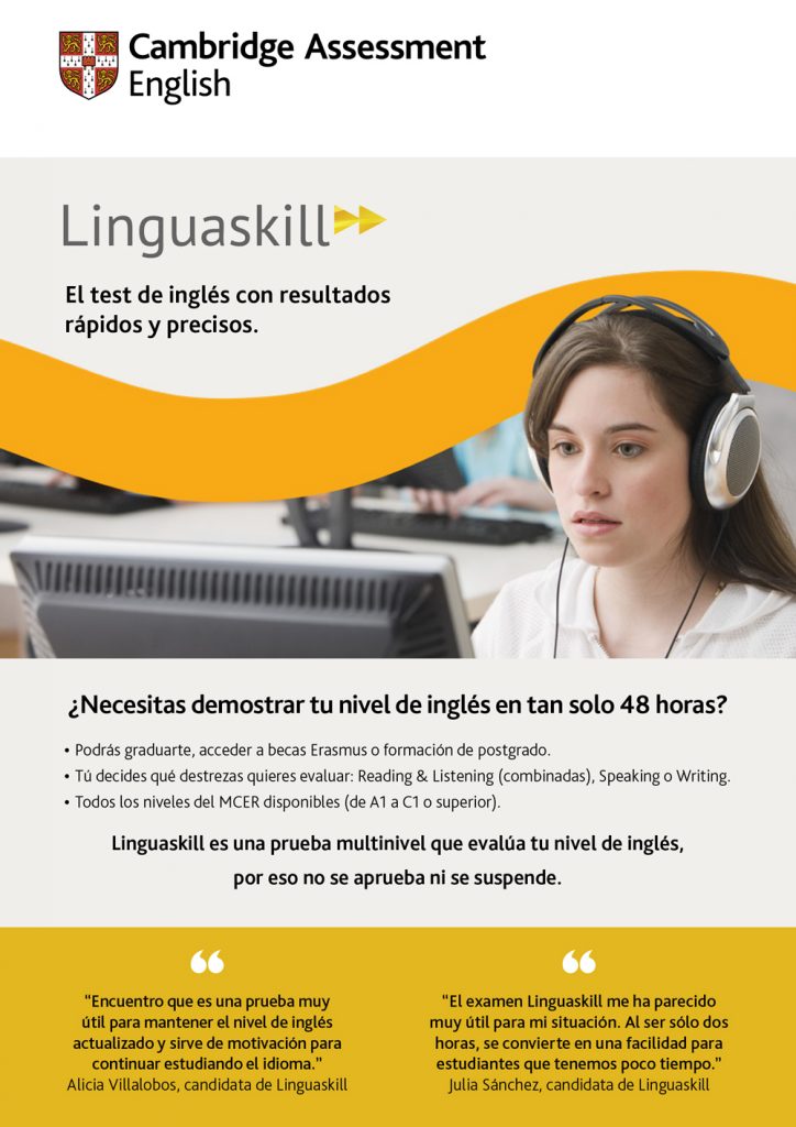Linguaskill es ideal para las empresas que realizan procesos de selección/promoción de personal, para docentes que quieren medir el desarrollo del aprendizaje del idioma inglés de sus alumnos o simplemente para quienes quieren saber su nivel de inglés a través de un test con aval internacional.