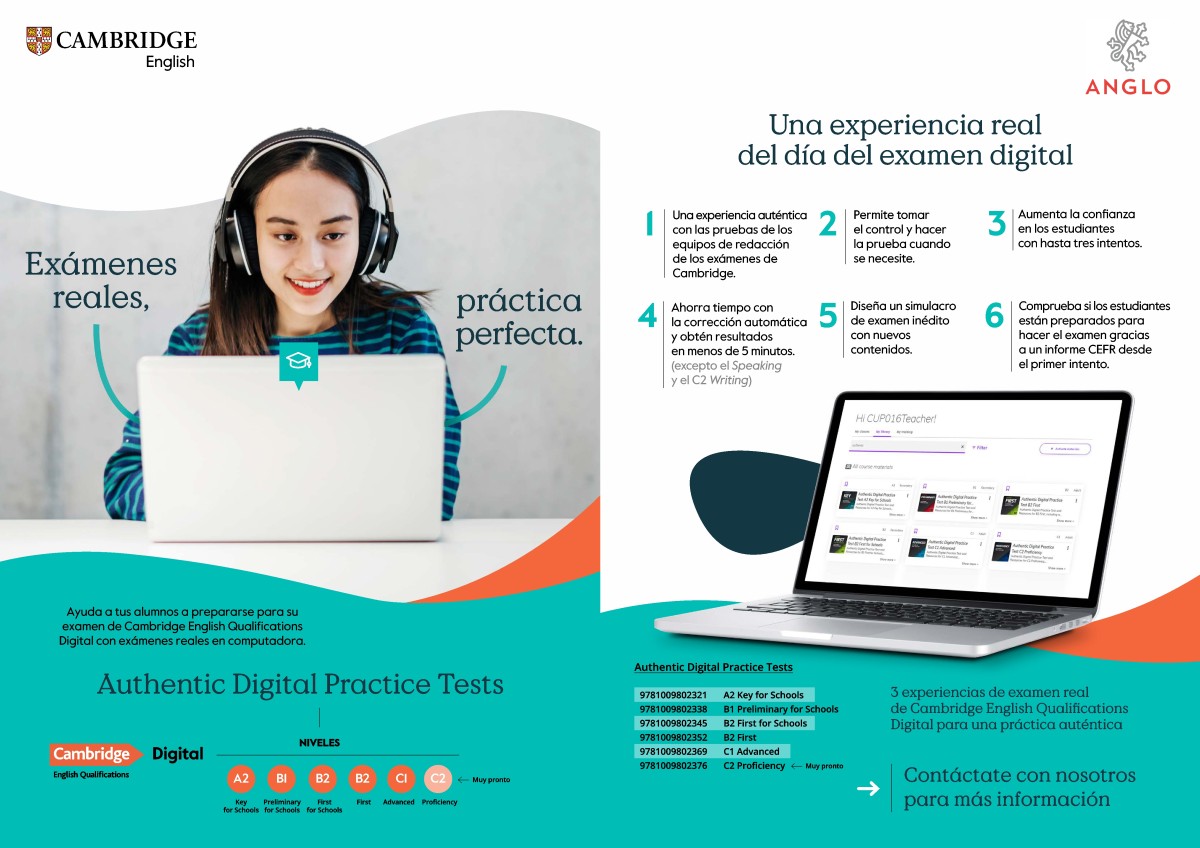 ADPT es una herramienta digital de Cambridge English diseñada para ofrecer una experiencia de práctica auténtica, idéntica al examen digital. Estos simuladores de exámenes permitirán que te familiarices con el formato real del examen, gestionar el tiempo y mejorar tus habilidades en cada área evaluada.
